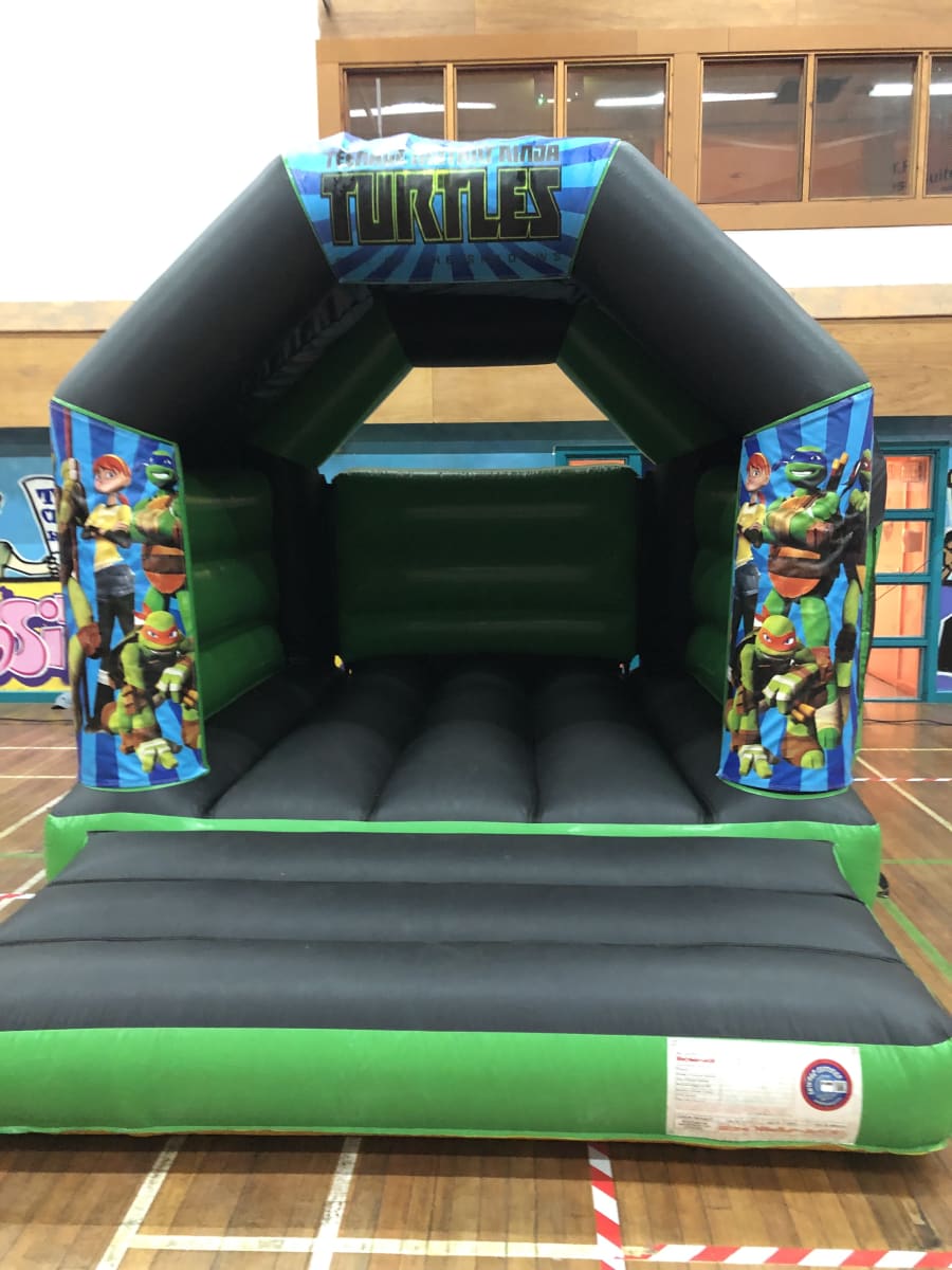 Ninja turtles artwork bouncy castle 12ft x 15ft x 9ft The Ninja Castle is ideal for all those budding fans out there. Would you like to be the talk of school for having the coolest castle at your party. This is one the newest castles within our fleet and I'm proud to say the graphics are amazing. This inflatable also incorporates an inflatable step to enable children to get on and off the castle with ease and prevent falling onto hard ground.