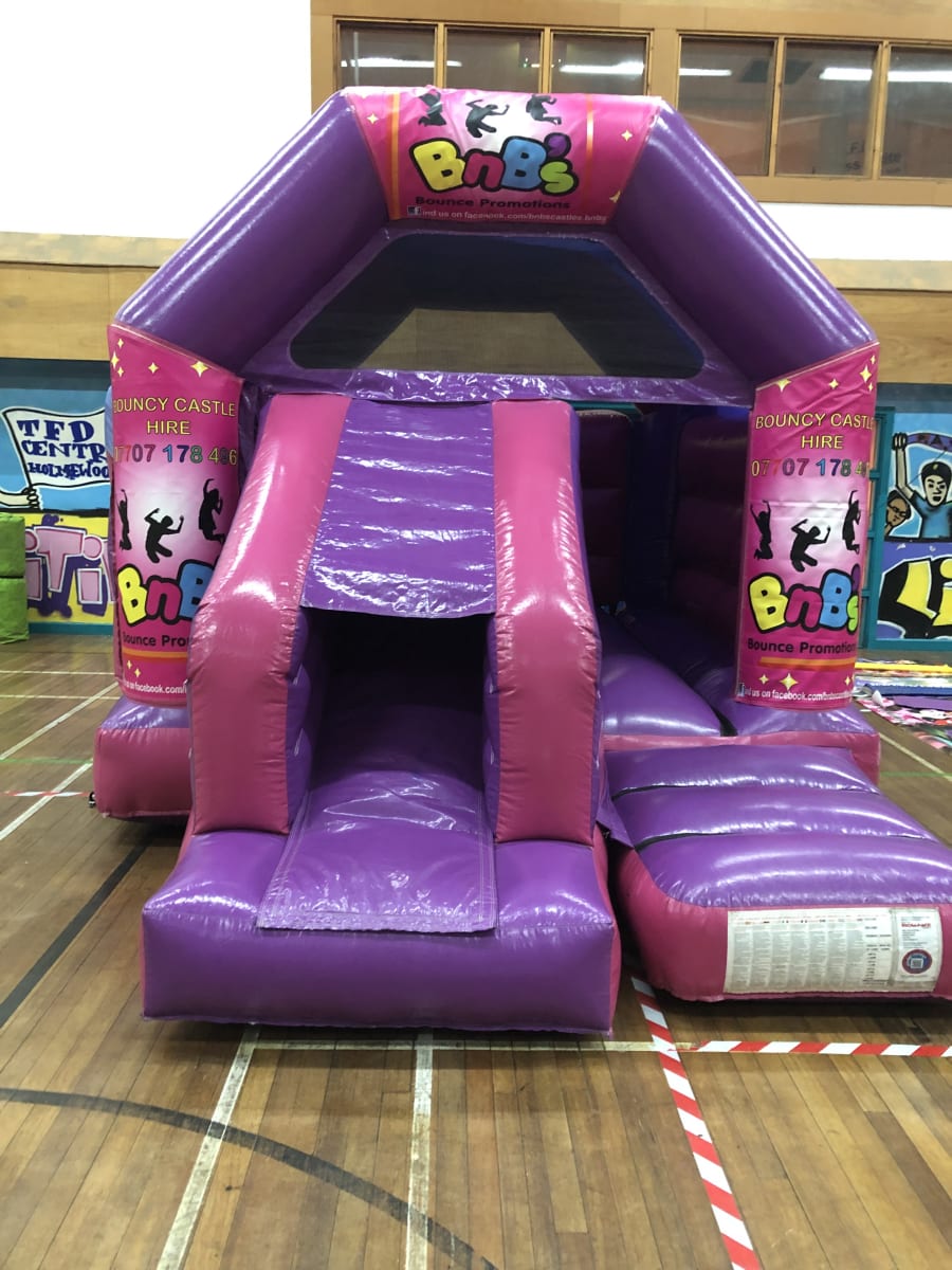 This pink and purple 13ft wide by 17ft in length combo is perfect for those long narrow gardens. It comes with a cover for light rain. The castle features our amazing logo but if you would like this castle with a different theme please call on us on 07707178496.