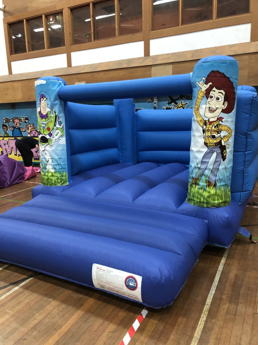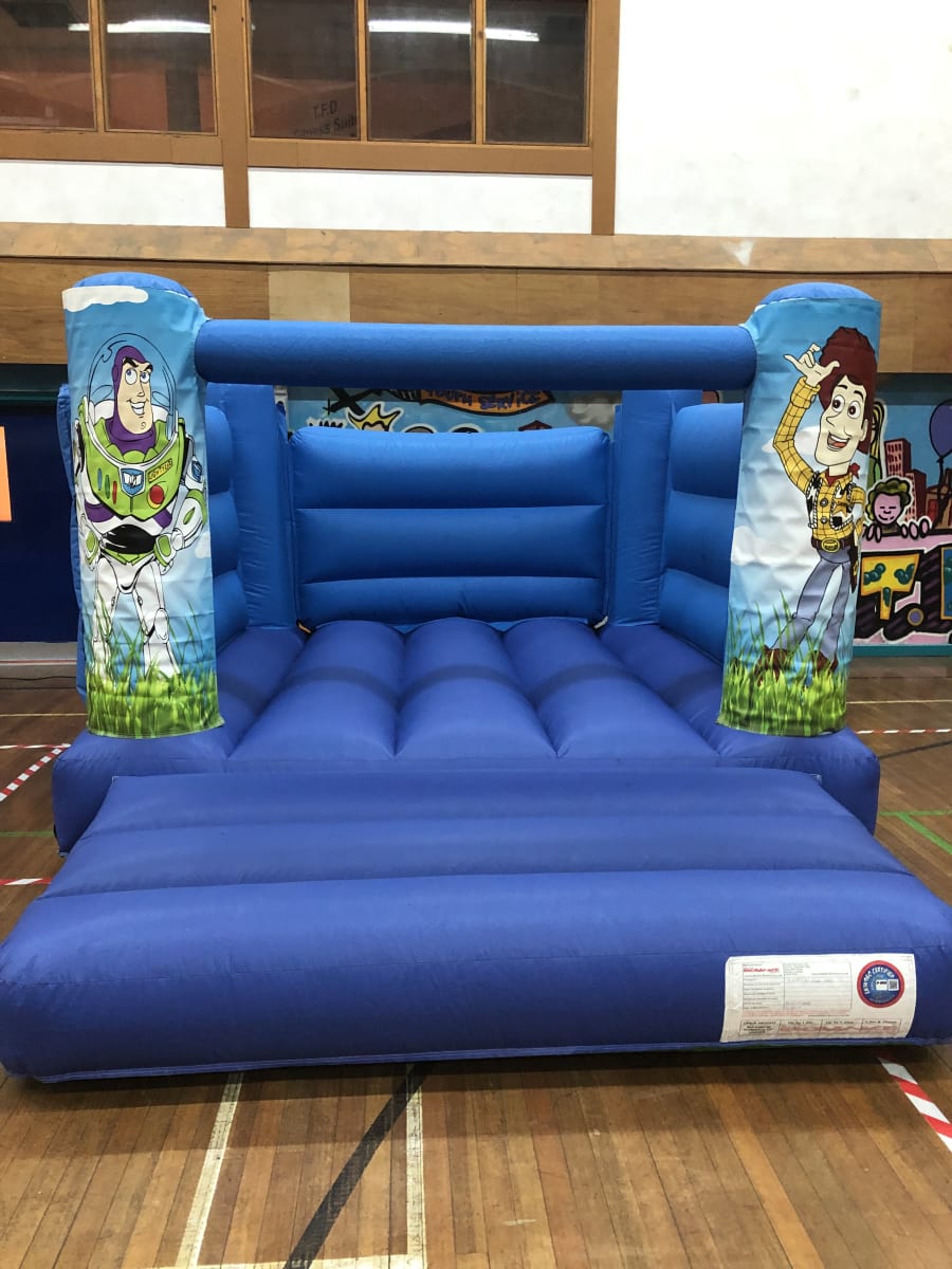 Our new buzz and woody Toy Story indoor bouncy castle. The indoor toy story is a low castle that stands 7.5ft high so it fits inside most Local Venues. This castle is 11ft wide and 14ft in length.